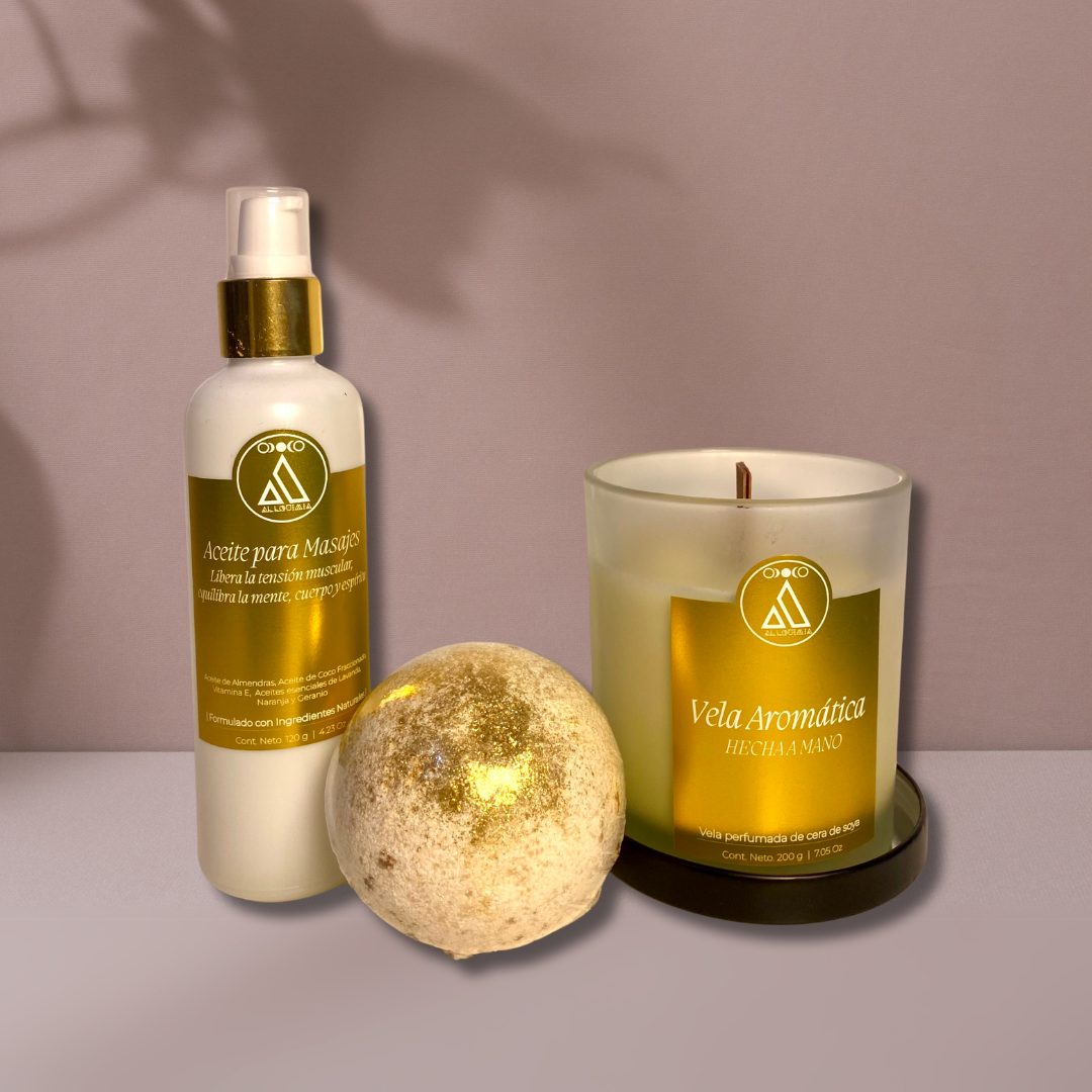 Disfruta de la calidez de una Vela de Soya, el aroma relajante de nuestro Aceite para Masajes y el efecto renovador que tendrás con nuestras Bath Bombs.