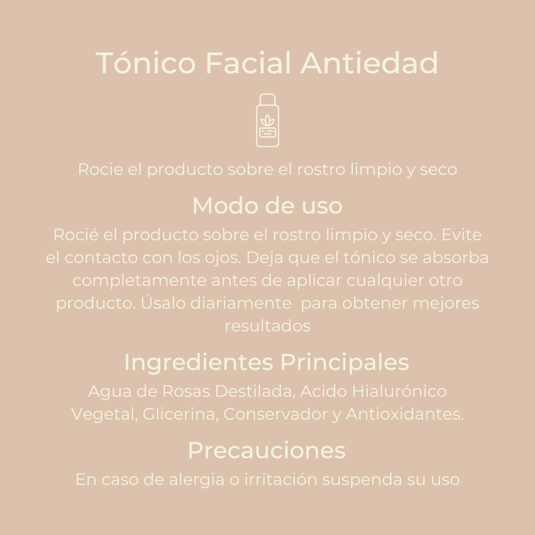 Agua de rosas destilada, acido hialurónico vegetal, Glicerina, Conservador y Antioxidantes.